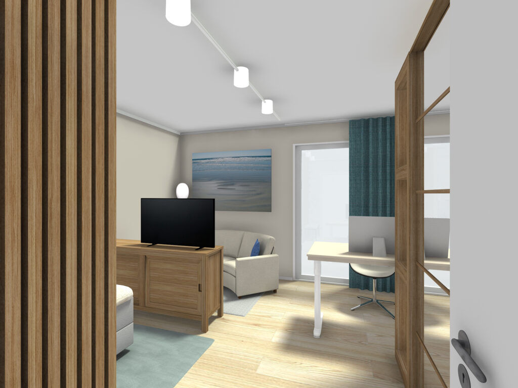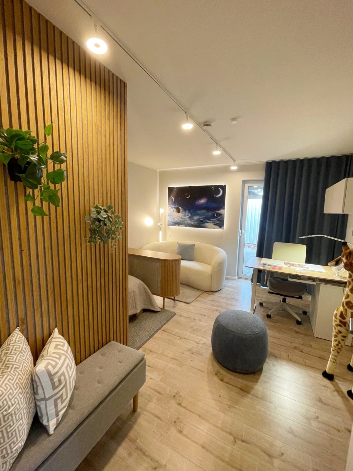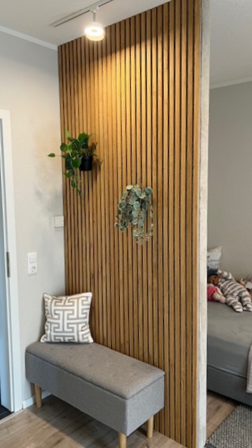 Das große Boxspringbett wurde aus der Raummitte in den Eingangsbereich verlegt. Eine elegante Akustikwand mit Holzlamellen trennt den Schlafbereich ab und lässt sich flexibel mit Pflanzen, Regalen oder Garderobenhaken gestalten.